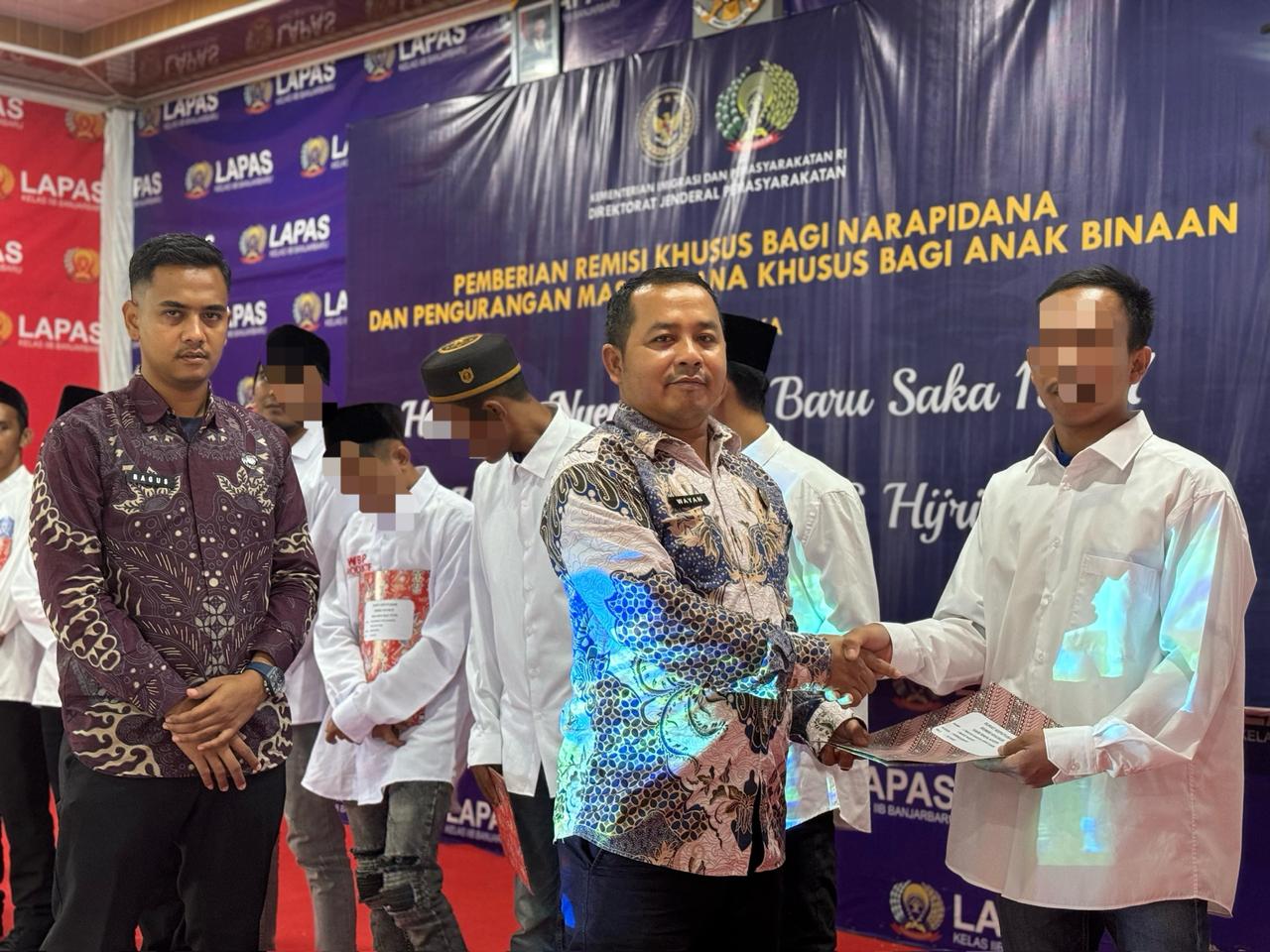 Banjarbaru, INFO_PAS – Sebanyak 1.326 Warga Binaan Lembaga Pemasyarakatan (Lapas) Kelas IIB Banjarbaru memperoleh Remisi Khusus (RK) Hari Raya Nyepi Tahun Baru Saka 1947 dan Idulfitri 1446 Hijriah dari Pemerintah Republik Indonesia melalui Kementerian Imigrasi dan Pemasyarakatan (Imipas), Jumat (28/3). RK diserahkan secara simbolis oleh Kepala Lapas Banjarbaru, I Wayan Nurasta Wibawa. Kegiatan serupa juga dilakukan secara serentak pada Unit Pelaksana Teknis Pemasyarakatan seluruh Indonesia yang terhubung melalui zoom.