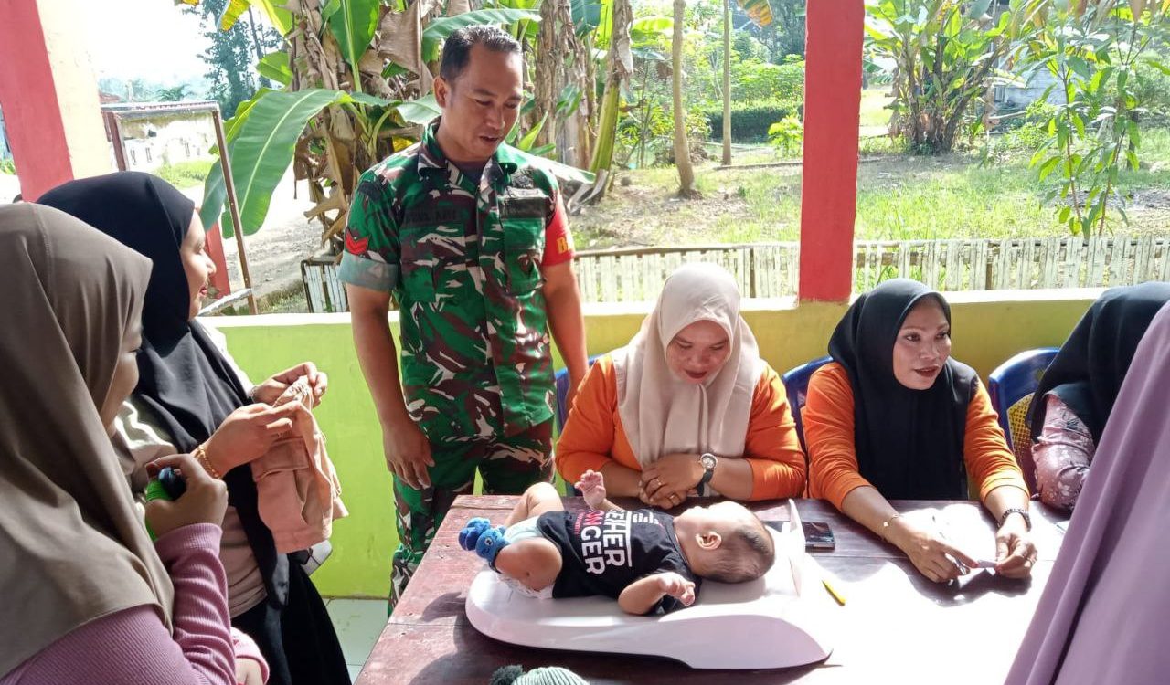 Dalam kegiatan tersebut, Koptu Abdul Azis turut membantu proses penimbangan balita, pencatatan kesehatan, serta berinteraksi langsung dengan para kader Posyandu dan warga yang hadir.