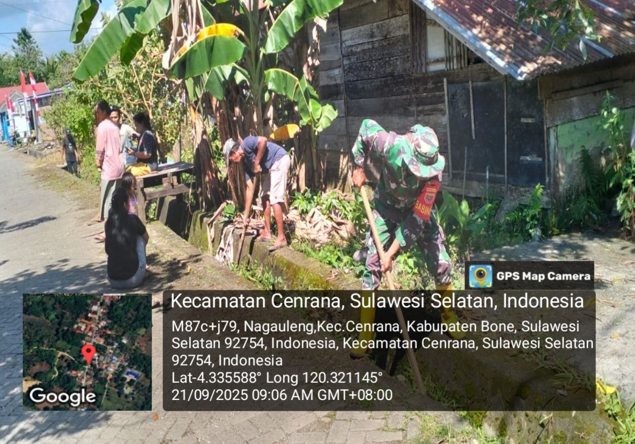 BONE – Babinsa Koramil 1407-03/Cenrana Serda Muliyawan Milu melaksanakan karya bakti bersama warga di Dusun Turungeng Sapie, Desa Nagauleng, Kecamatan Cenrana, Kabupaten Bone. Minggu sore (21/09/25).