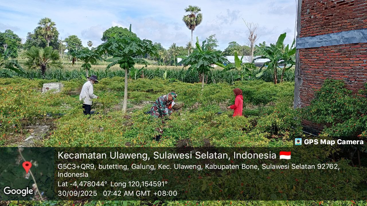 BONE – Babinsa Koramil 05/Ulaweng Kodim 1407/Bone Sertu Wahyuddin melaksanakan pendampingan kepada petani dalam proses panen cabai di lahan perkebunan milik warga Desa Galung, Kecamatan Ulaweng, Kabupaten Bone. Selasa siang (30/09/25)