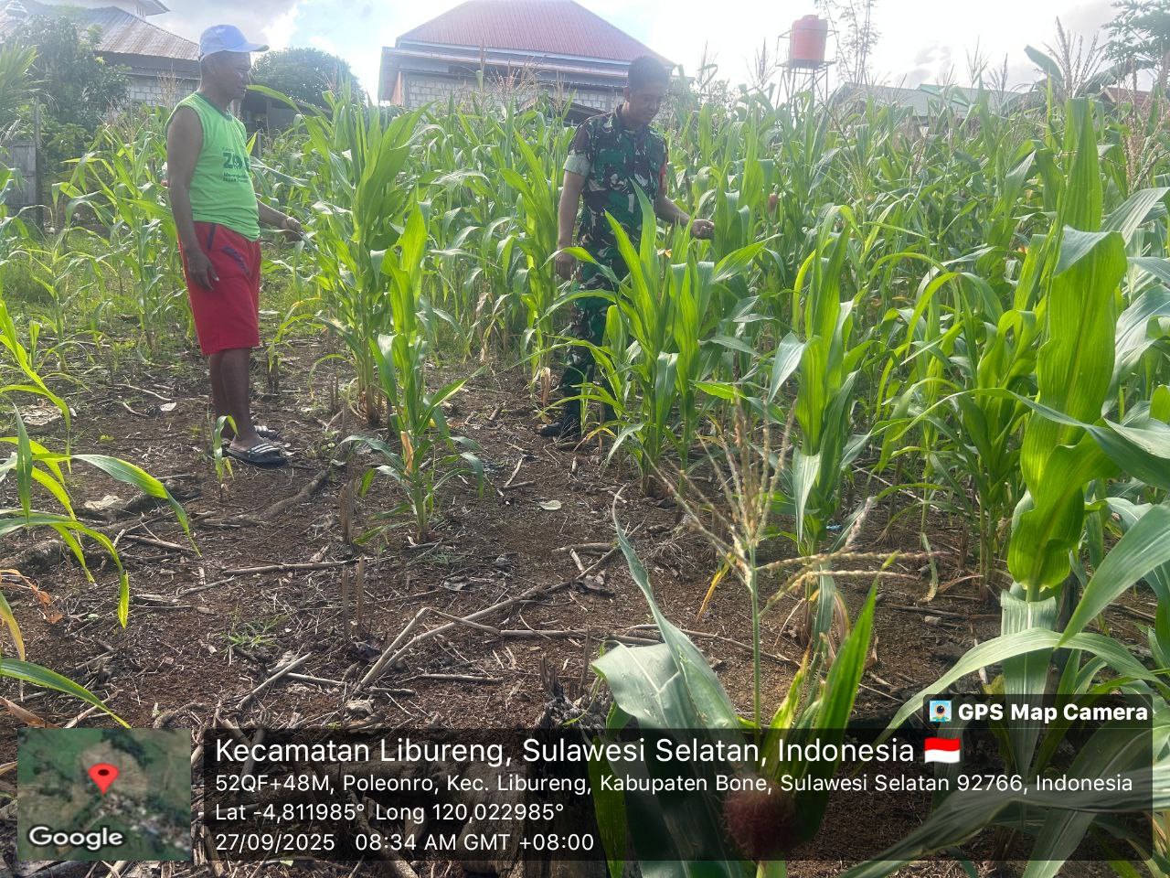 Bone – Dalam upaya mendukung ketahanan pangan nasional, Serda Ruslan, Babinsa Koramil 14/Libureng Kodim 1407/Bone, melaksanakan pendampingan kepada para petani di Desa Poleonro, Kecamatan Libureng, Kabupaten Bone. Sabtu siang (27/09/25)