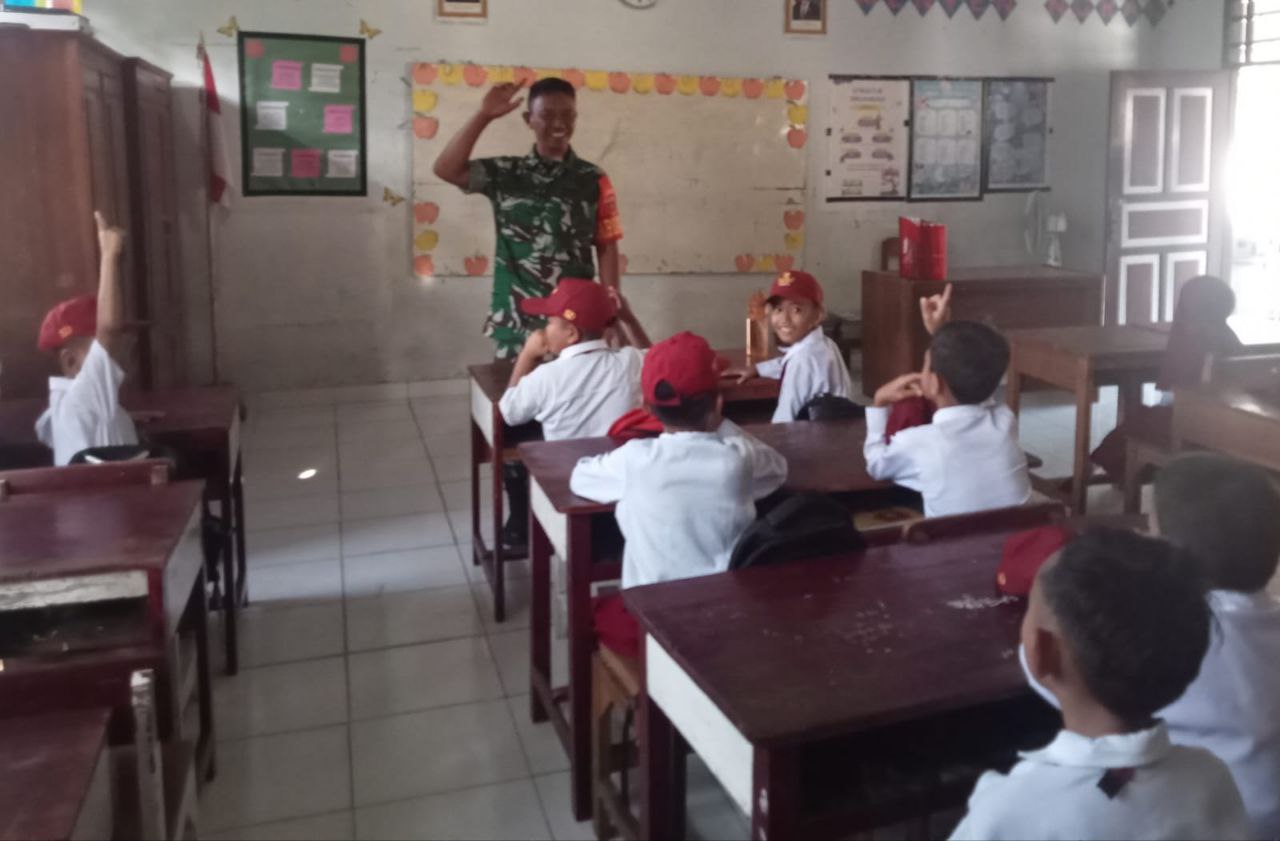 Dalam kesempatan tersebut, Serda Rusanto menjelaskan kepada para siswa mengenai tugas dan peran TNI dalam menjaga kedaulatan negara serta pentingnya semangat bela negara dalam kehidupan sehari-hari.
