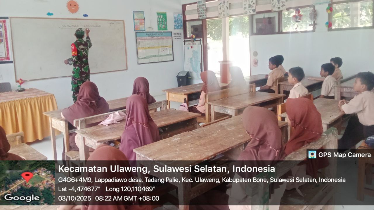 BONE – Babinsa Koramil 1407-05/Ulaweng Serda Asri Rais melaksanakan pembinaan Perlawanan Wilayah (Wanwil) kepada siswa SD Inpres 12/79 Tadang Palie yang terletak di Dusun Lappadiawo, Desa Tadang Palie, Kec. Ulaweng, Kab. Bone. Jumat siang (03/10/25).