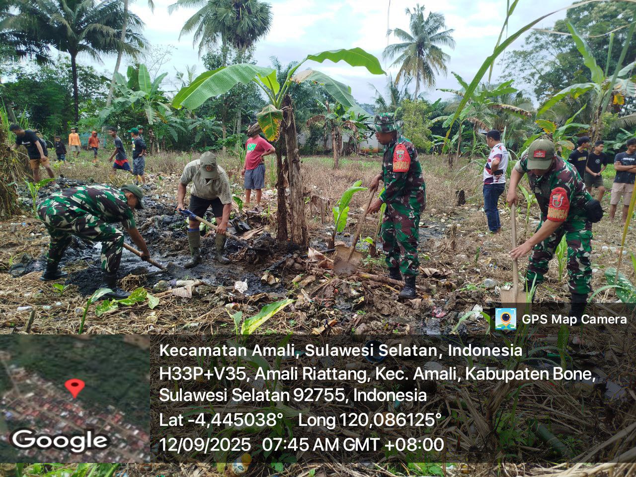 Bone – Dalam upaya menjaga kebersihan lingkungan dan mencegah terjadinya genangan air yang dapat menyebabkan berbagai penyakit, Bintara Pembina Desa (Babinsa) Koramil 1407-05/Ulaweng, Pelda M. Ridwan, melaksanakan kegiatan karya bakti bersama warga binaannya di Desa Amali Riattang, Kecamatan Amali, Kabupaten Bone. Jumat (12/09/2025).