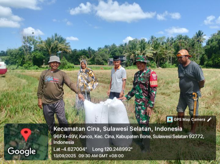 Bone – Babinsa Koramil 1407-12/Cina, Sertu Irtang, melaksanakan pendampingan panen padi bersama para petani di wilayah binaannya, tepatnya di Desa Kanco, Kecamatan Cina, Kabupaten Bone. Sabtu sore (13/09/2025).