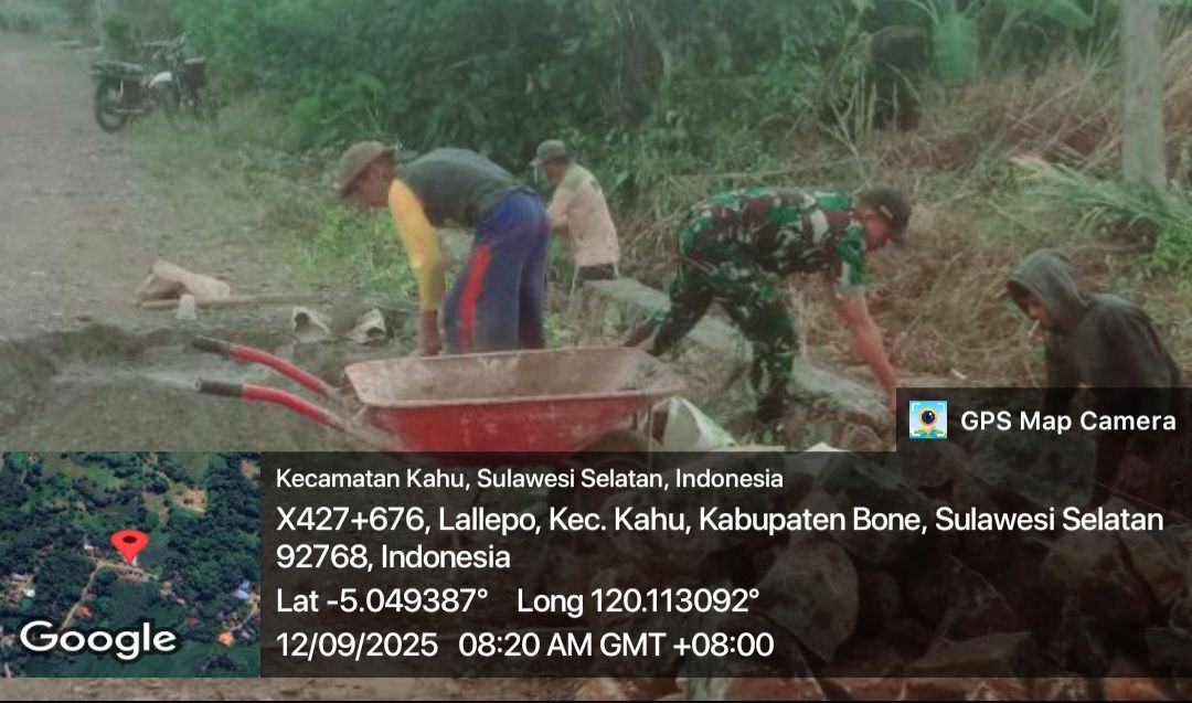 Bone – Babinsa Koramil 19/Kahu, Kodim 1407/Bone, Serda Agus bersama masyarakat setempat melaksanakan kegiatan karya bakti pembangunan talud jalan sepanjang 100 meter di Desa Lalepo, Kecamatan Kahu, Kabupaten Bone. Jumat (12/09/2025).