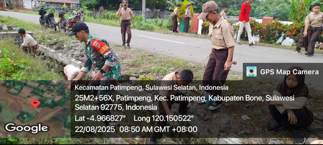 Bone — Babinsa Koramil 19/Kahu, Kodim 1407/Bone Serda Akbar melaksanakan kegiatan Karya Bhakti atau gotong royong bersama guru dan siswa SD Negeri 259 di Desa Patimpeng, Kecamatan Patimpeng, Kabupaten Bone. Jumat (22/08/2025).