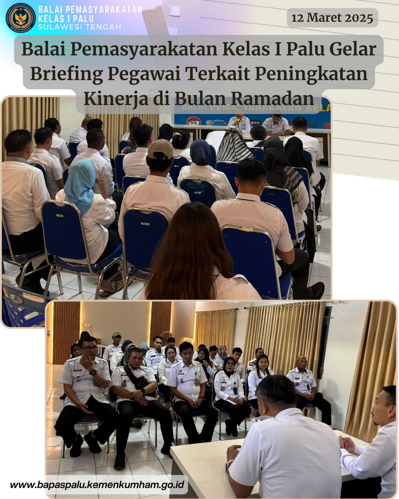 Palu, 12 Maret 2025 – Balai Pemasyarakatan (Bapas) Kelas I Palu melaksanakan kegiatan briefing pegawai yang diadakan di Aula Bapas Kelas I Palu pada Rabu, 12 Maret 2025, pukul 09.00 WITA. Kegiatan ini bertujuan untuk membahas peningkatan kinerja pegawai selama bulan suci Ramadan, meskipun jam kerja pegawai di bulan tersebut lebih sedikit dibandingkan dengan hari kerja biasa.