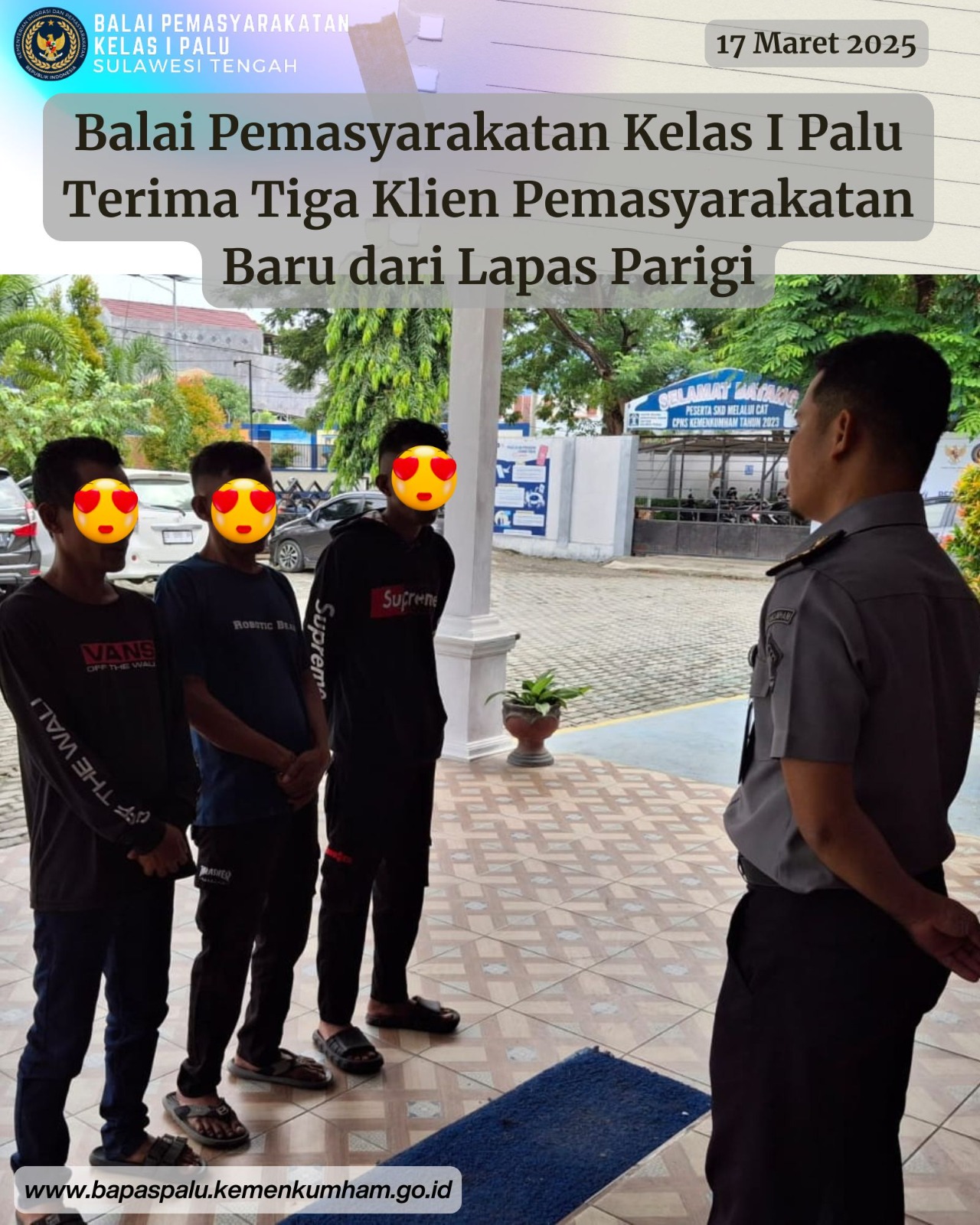 Palu – Balai Pemasyarakatan (Bapas) Kelas I Palu menerima tiga klien pemasyarakatan baru yang mendapatkan program Cuti Bersyarat (CB) dari Lembaga Pemasyarakatan (Lapas) Kelas III Parigi. Ketiga klien tersebut akan menjalani masa pembimbingan dan pengawasan di bawah Bapas Kelas I Palu.