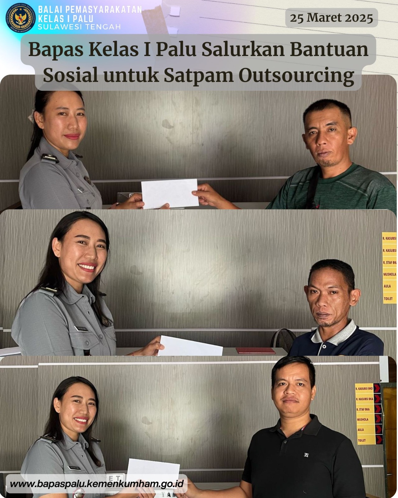 Balai Pemasyarakatan (Bapas) Kelas I Palu menunjukkan kepeduliannya terhadap karyawan outsourcing dengan memberikan bantuan sosial berupa dana tunai kepada tiga orang satpam yang bertugas di kantor tersebut. Kegiatan ini dilaksanakan pada hari Selasa, 26 Maret 2025.