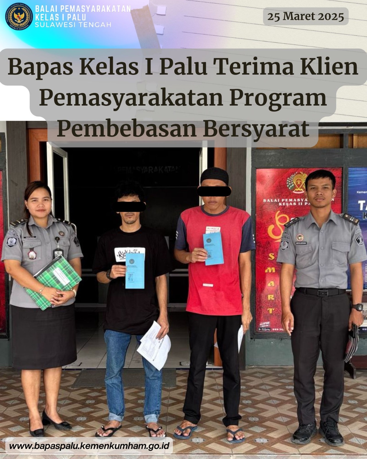 Palu, 25 Maret 2025 – Balai Pemasyarakatan (Bapas) Kelas I Palu menerima klien pemasyarakatan yang telah bebas dari Lembaga Pemasyarakatan (Lapas) Kelas IIA Palu. Klien tersebut mendapatkan program integrasi berupa Pembebasan Bersyarat (PB).