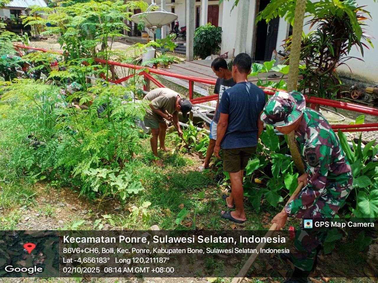 BONE – Anggota Koramil 1407-10/Ponre bersama masyarakat melaksanakan kerja bakti pembersihan parit kanan kiri jalan yang berlokasi di Desa Bolli Kec. Ponre, Kab. Bone, Kamis Siang (02/10/25)