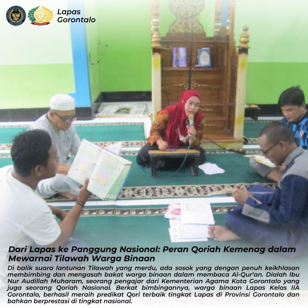 Gorontalo, 28 Maret 2025 – Di balik suara lantunan Tilawah yang merdu, ada sosok yang dengan penuh keikhlasan membimbing dan mengasah bakat warga binaan dalam membaca Al-Qur’an. Dialah Nur Audillah Muharam, seorang pengajar dari Kementerian Agama Kota Gorontalo yang juga seorang Qoriah Nasional. Berkat bimbingannya, warga binaan Lapas Kelas IIA Gorontalo, berhasil meraih predikat Qori terbaik tingkat Lapas di Provinsi Gorontalo dan bahkan berprestasi di tingkat nasional.