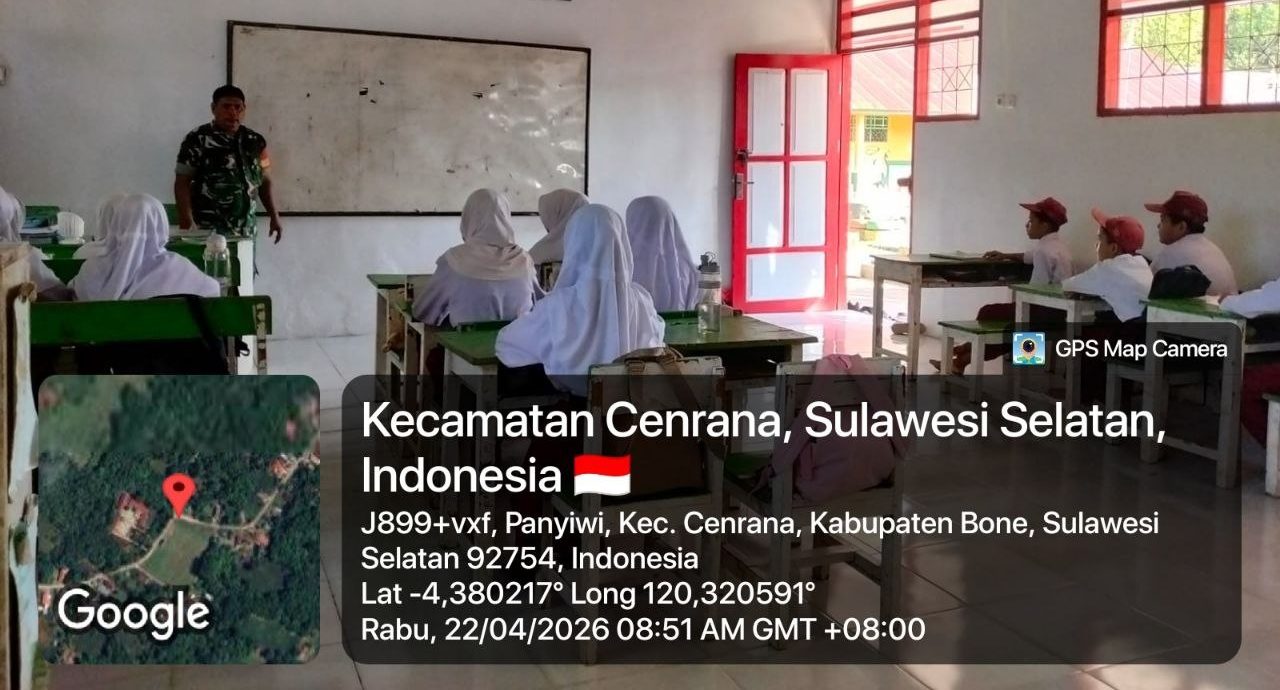 BONE – Babinsa Koramil 1407-03/Cenrana Serma Suhardi melaksanakan Pembinaan Perlawanan Wilayah (Binwanwil) di SD Negeri 74 Panyiwi, Desa Panyiwi, Kec. Cenrana, Kab. Bone. Rabu siang (22/04/26).