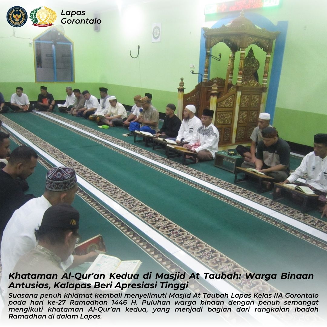 Gorontalo – Suasana penuh khidmat kembali menyelimuti Masjid At Taubah Lapas Kelas IIA Gorontalo pada hari ke-27 Ramadhan 1446 H. Puluhan warga binaan dengan penuh semangat mengikuti khataman Al-Qur’an kedua, yang menjadi bagian dari rangkaian ibadah Ramadhan di dalam Lapas.