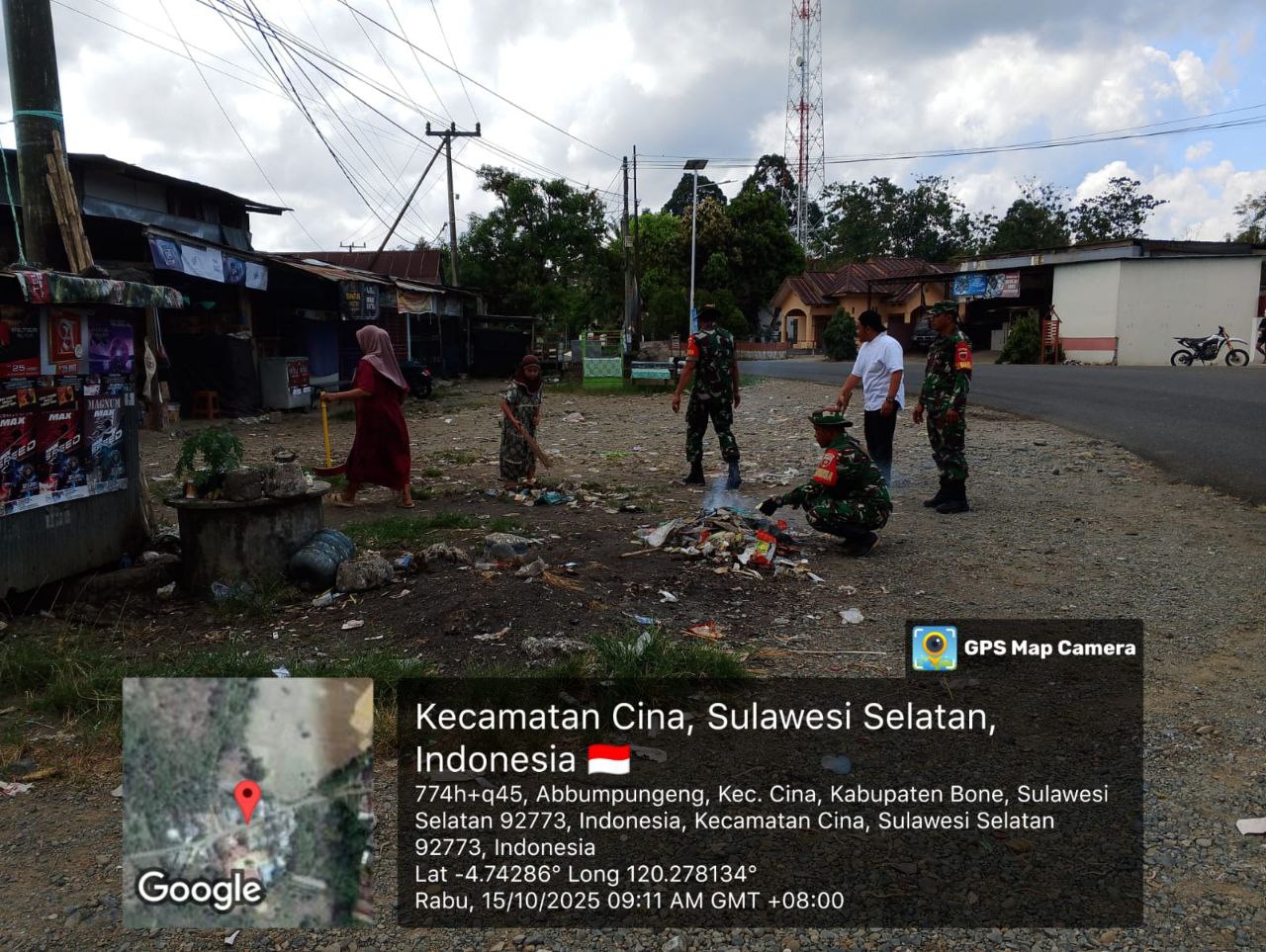 Bone — Personel Koramil 1407‑12/Cina melaksanakan kegiatan karya bakti bersama warga di Pasar Desa Abbumpungeng, Kecamatan Cina, Kabupaten Bone, Rabu Siang (15/10/25).