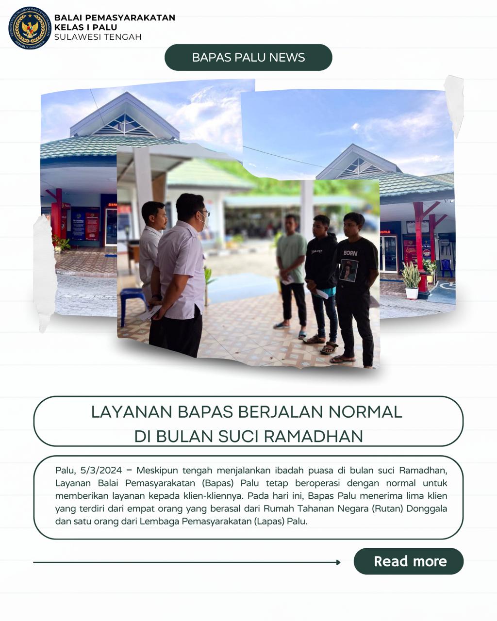 Bapas Palu tetap memastikan pelayanan yang optimal bagi klien-kliennya meskipun bulan Ramadhan, dengan mengutamakan keseimbangan antara pelaksanaan ibadah dan kepentingan reintegrasi sosial. Diharapkan melalui layanan yang tetap berjalan dengan baik, klien-klien ini dapat menjalani masa pembimbingan dengan penuh kesadaran dan tanggung jawab.