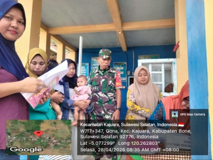 BONE – Babinsa Koramil 1407-18/Kajuara Serda Muchlis melaksanakan kegiatan pendampingan Posyandu di Desa Padaelo, Kecamatan Kajuara, Kabupaten Bone. Selasa siang (28/04/26).