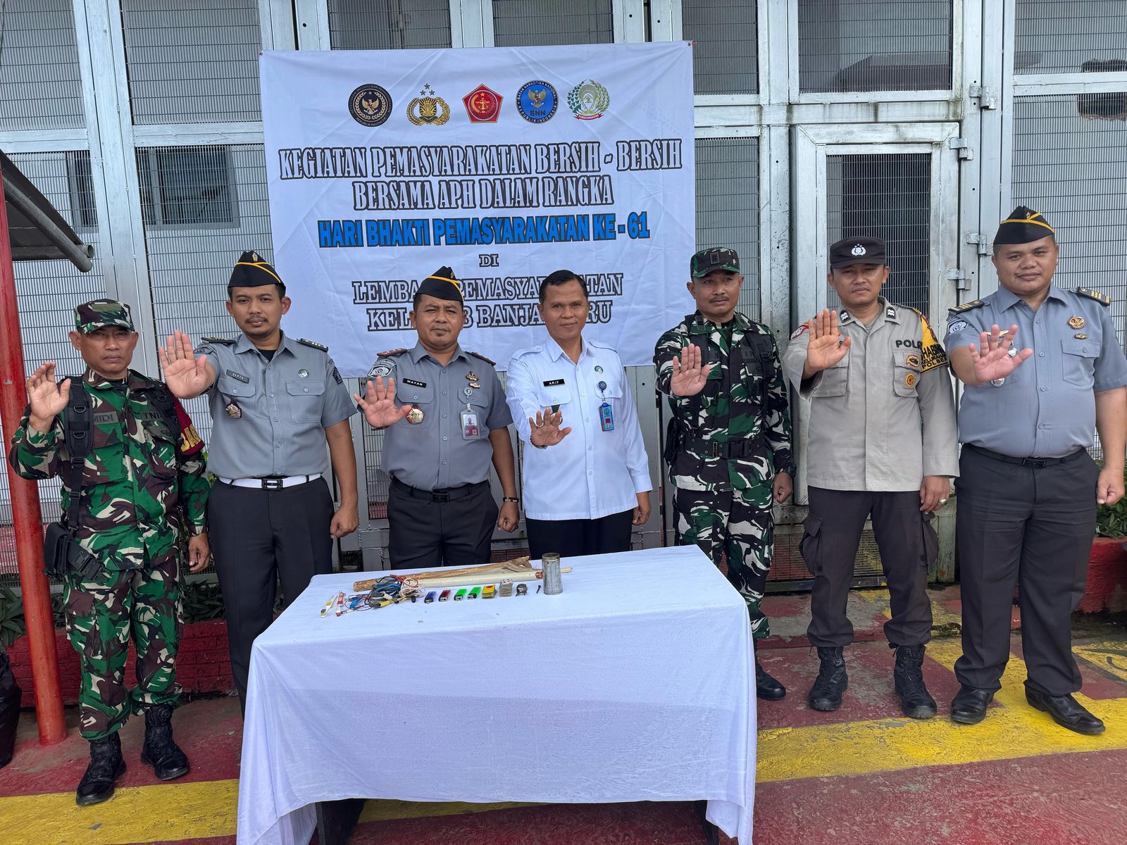 Banjarbaru, INFO_PAS – Lembaga Pemasyarakatan (Lapas) Kelas IIB Banjarbaru bersinergi dengan Badan Narkotika Nasional Kota (BNNK) Banjarbaru, Kepolisian Sektor (Polsek) Cempaka, dan Komando Rayon Militer (Koramil) 1006-07/Banjarbaru gelar razia kamar Warga Binaan, Senin (17/3). Razia bertajuk Pemasyarakatan Bersih-Bersih dilaksanakan sebagai salah satu rangkaian peringatan Hari Bakti Pemasyarakatan (HBP) Ke-61.