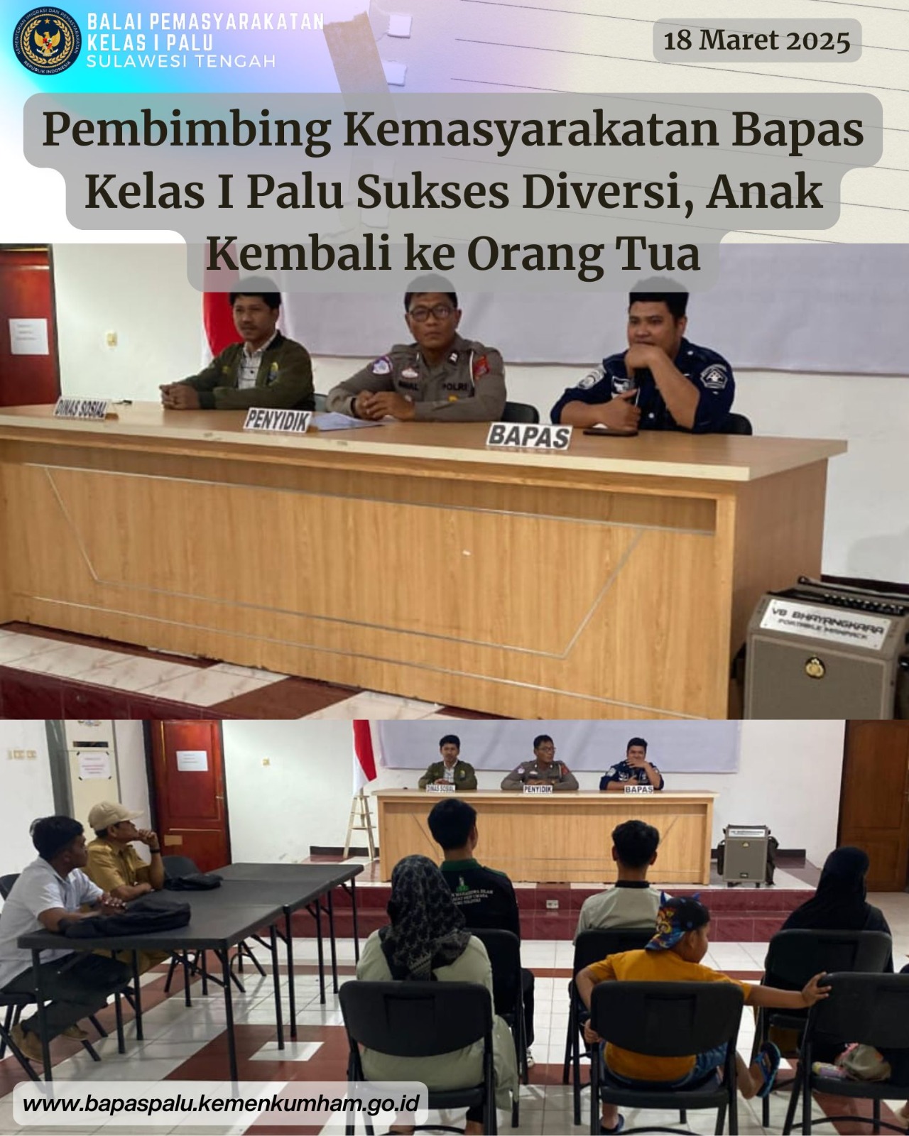 Tolitoli – Kabar gembira datang dari Balai Pemasyarakatan (Bapas) Kelas I Palu. Pembimbing Kemasyarakatan (PK) Bapas Kelas I Palu, Rifkiansyah, berhasil melaksanakan diversi dalam proses penyidikan terhadap anak yang berhadapan dengan hukum di Kepolisian Resor (Polres) Tolitoli. Hasilnya, anak tersebut berhasil dikembalikan kepada orang tuanya (AKOT).