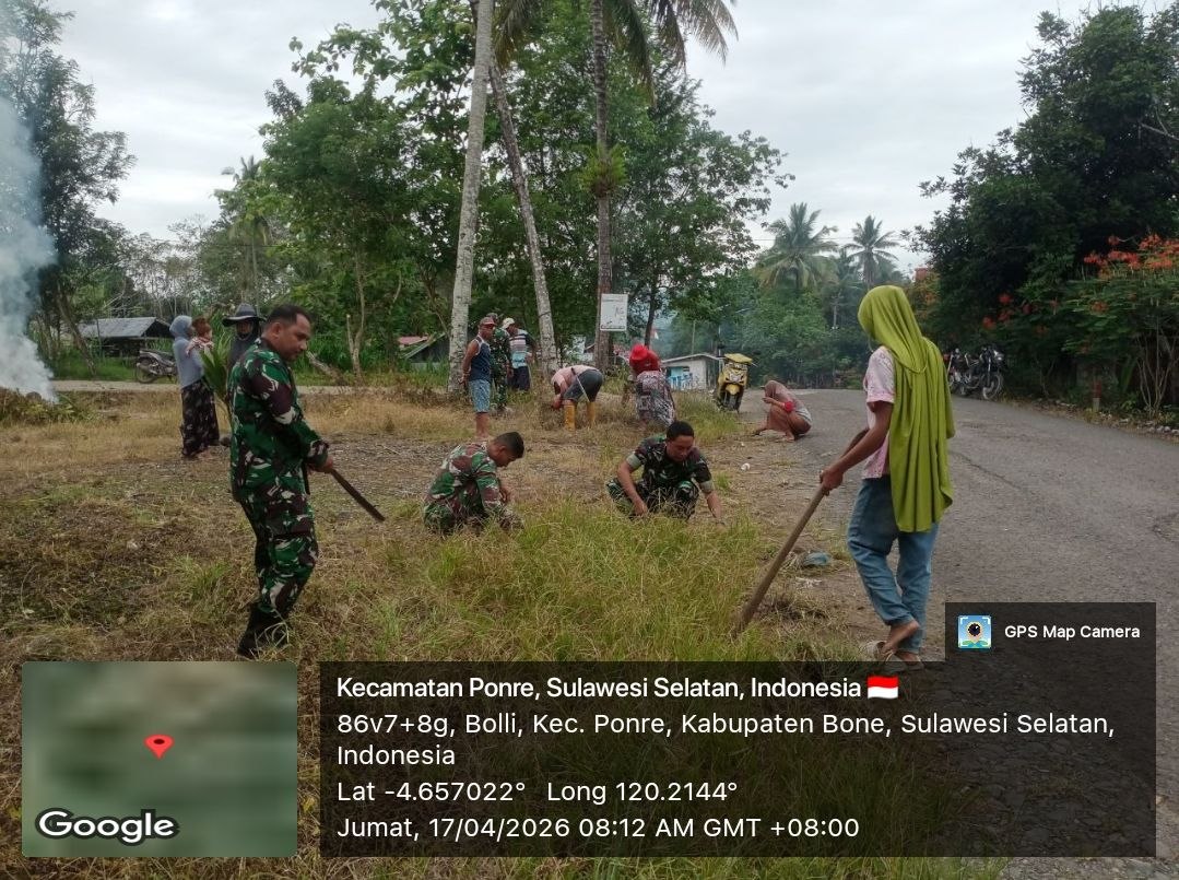Bone – Babinsa Koramil 1407-10/Ponre bersama masyarakat melaksanakan kerja bakti pembersihan rumput liar di sepanjang jalan yang berlokasi di Dusun Lawari, Desa Bolli, Kecamatan Ponre, Kabupaten Bone. Jumat siang (17/04/26).