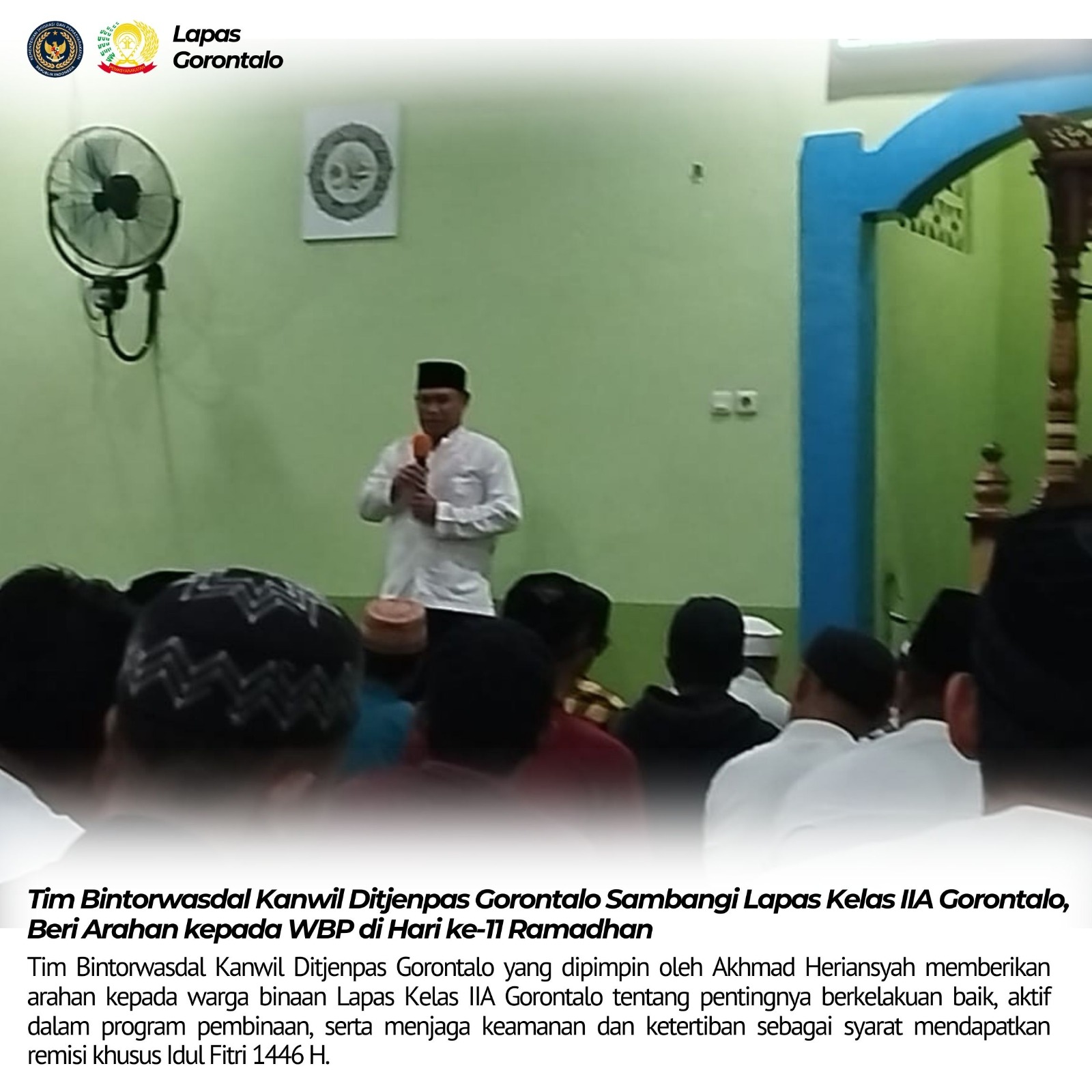 Dalam rangka memastikan kelancaran pembinaan dan pemberian hak-hak bagi warga binaan, Tim Bintorwasdal Kanwil Ditjenpas Gorontalo mengunjungi Lapas Kelas IIA Gorontalo. Tim yang dipimpin oleh Akhmad Heriansyah, selaku Kabid Pembinaan Ditjenpas, turut didampingi oleh Kabag TU dan Umum serta Kabid Pembimbing Pemasyarakatan.