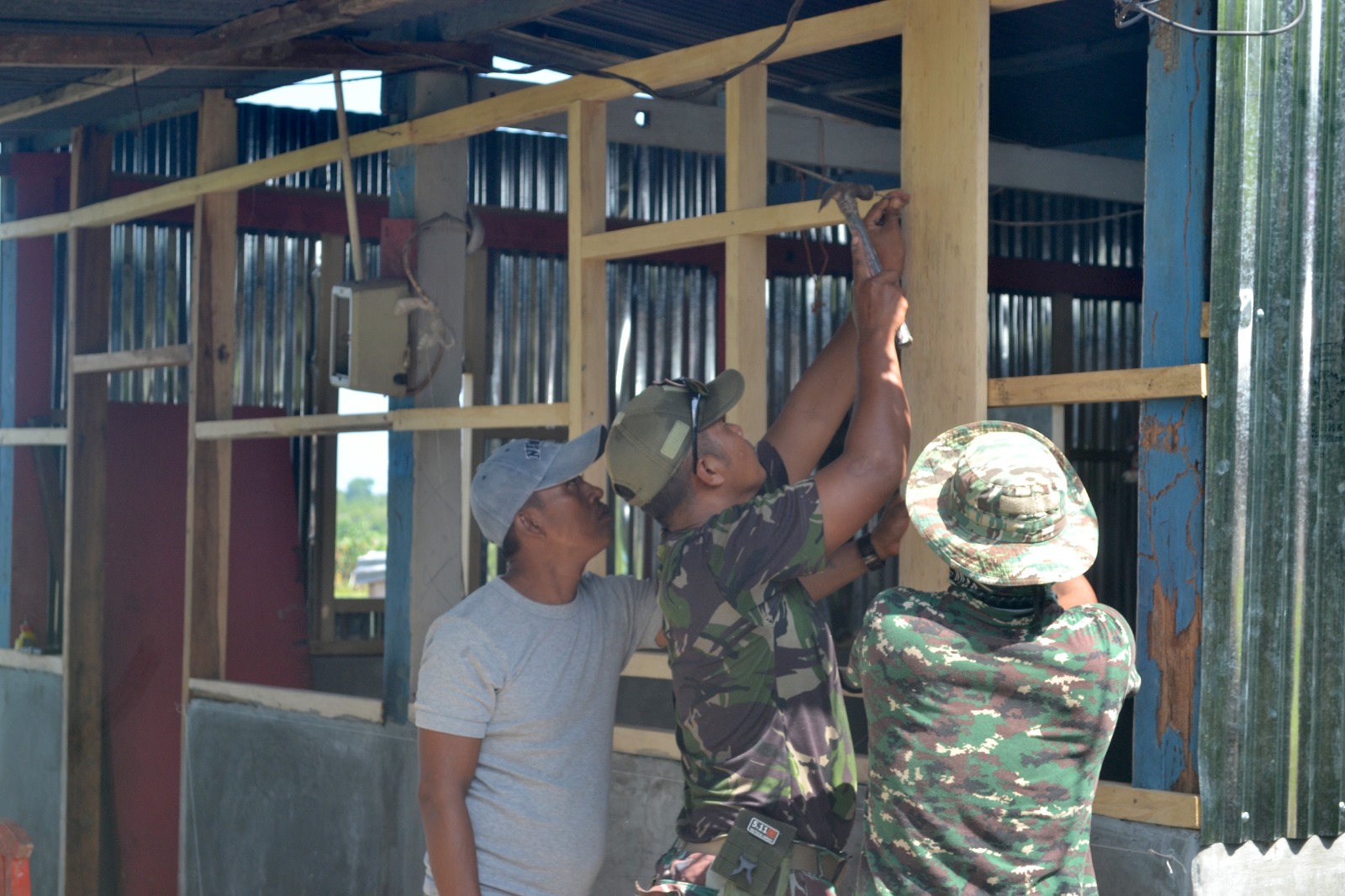 Semangat anggota Satgas TMMD tidak surut untuk pembangunan RTLH, itu terlihat saat anggota satgas TMMD bersama masyarakat bahu membahu melakukan pemasangan dinding seng. Satgas TMMD terus berkomitmen untuk menyelesaikan pembangunan rumah RTLH dengan sebaik-baiknya, demi meningkatkan kualitas hidup masyarakat.